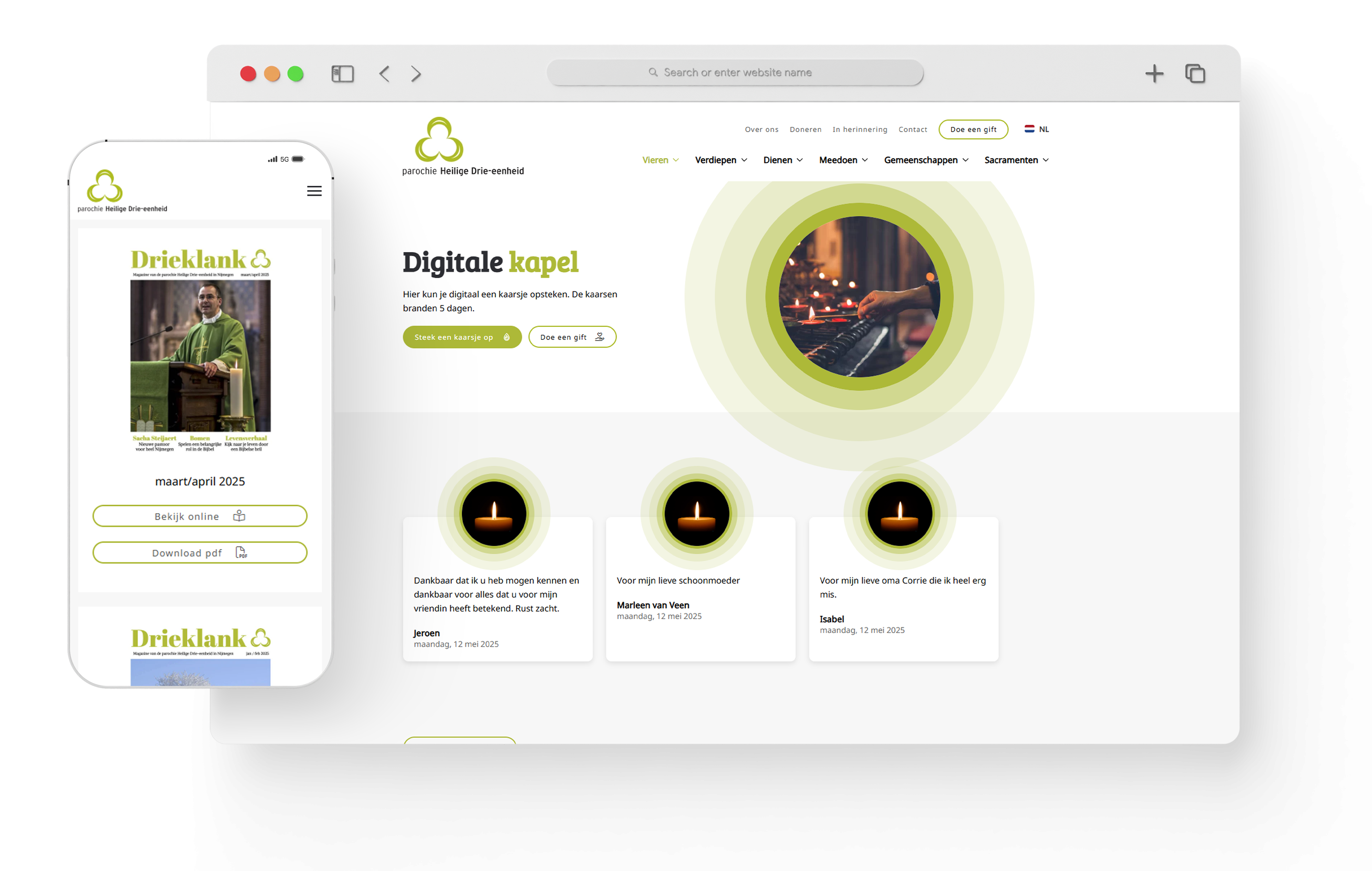 We ontwikkelden meerdere formulieren voor inschrijving op activiteiten, sommige inclusief iDEAL-betalingen. Doneren kan laagdrempelig via een vaste donatieknop. Ook is er ruimte voor reflectie: in de digitale kapel kan men een kaarsje branden, dat symbolisch tien dagen blijft staan.