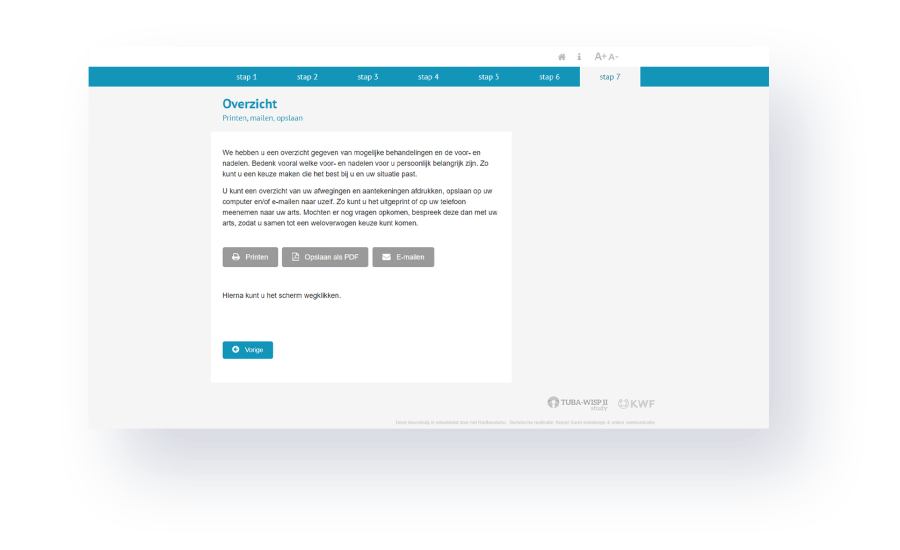Een keuzehulp die door een breed publiek eenvoudig doorlopen kan worden. De uitslag moet per mail naar de patiënt worden toegestuurd.