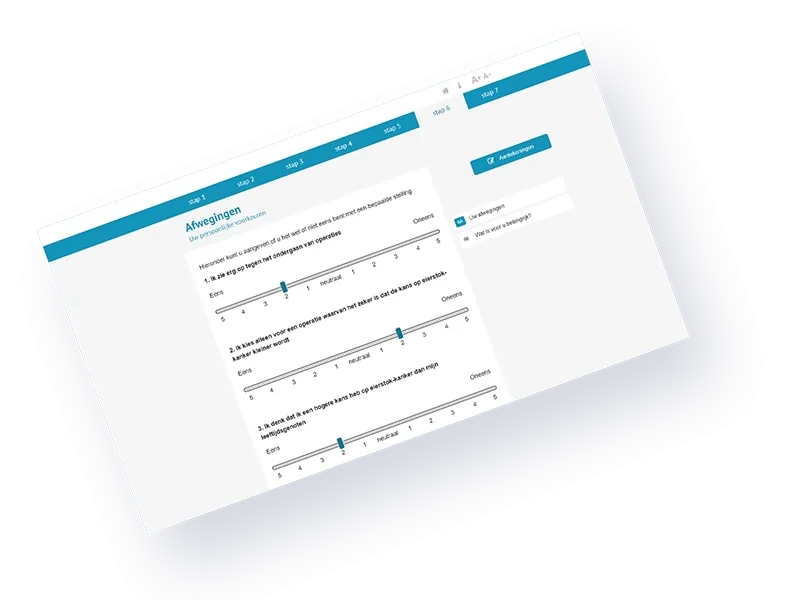 Samen met de Radboud Universiteit hebben we verschillende keuzehulpen voor patiënten ontwikkeld. Waar vroeger een arts zelf bepaalde welke behandeling een patiënt zou krijgen, wordt nu de patiënt zelf steeds meer betrokken bij het maken van een passende keuze.
