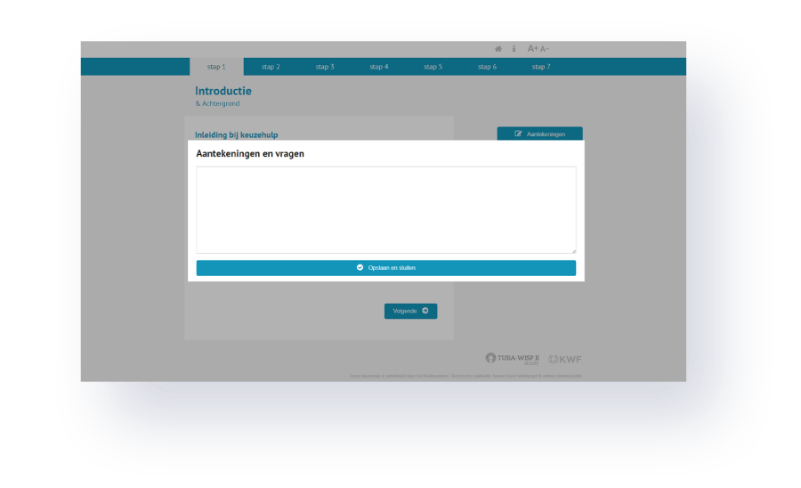 Tijdens alle stappen van de keuzehulp kunnen er aantekeningen worden gemaakt wanneer men iets niet goed heeft begrepen of wanneer er nog vragen zijn over een bepaald deel van de keuzehulp. Deze aantekeningen worden automatisch meegenomen in de resultaten van de keuzehulp.