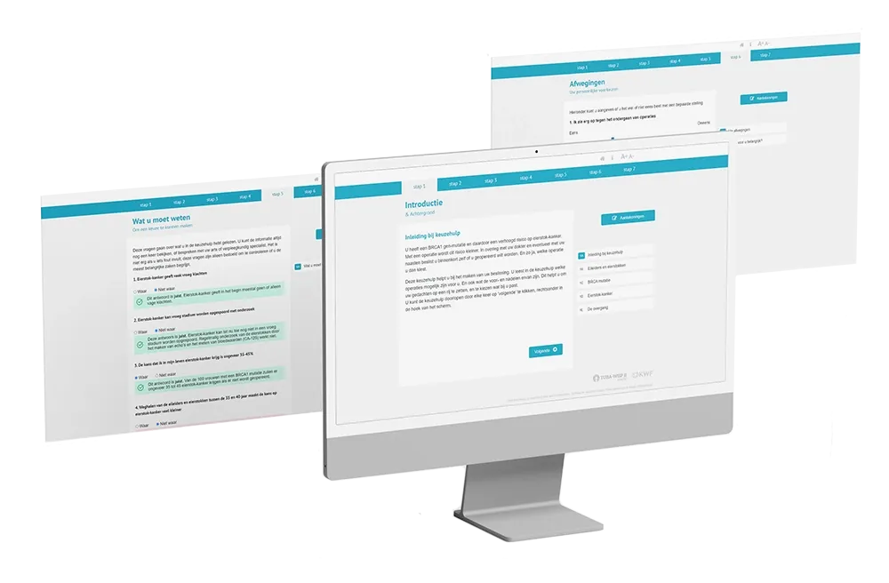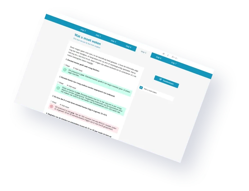 Omdat je alleen een bewuste keuze kunt maken als je alle benodigde informatie tot je hebt genomen en ook daadwerkelijk hebt begrepen, hebben we een quiz ingebouwd. Met de quiz wordt duidelijk of iemand de informatie uit eerdere stappen van de keuzehulp ook echt heeft begrepen. Wanneer een fout antwoord wordt gegeven, volgt automatisch het goede antwoord. Ook hebben mensen de mogelijkheid een stap terug te gaan en de pagina nog een keer door te lezen.